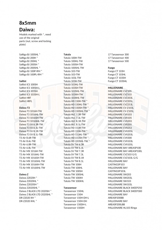 Admira, Blast, Daiwa SS, HRF, Ryoga, Advantage, Vadel, Alphas, IT’S, Aird, Catalina, Zillion, Steez, SPARTAN, Smak, Saltiga, Saltist, Daiwa T3, Daiwa Z, Tatula, Tanasensor, Fuego, MILLIONAIRE, Morethan, Light game ICV, KYOHGA, Kohga, Daiwa Tatula TWS 300, 301